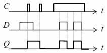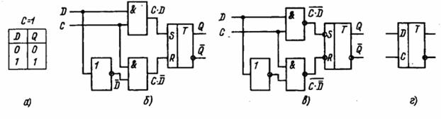 Синхронный D – триггер имеет информационный вход D и управляющий вход С. Его функционирование определяется таблицей состояний (рисунок 4.5, а). При С = 1 триггер устанавливается в состояние, определяемое логическим уровнем на входе D. При С = 0 он сохраняет предыдущее состояние. Функционирование синхронного триггера описывается логическим выражением: