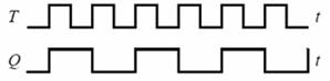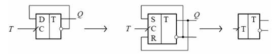 г Рисунок 4.6 – Т-триггер: а)преобразование D-триггера в Т-триггер; б) преобразование RS-триггера в Т-триггер; в) УГО Т-триггера; г) графики работы Т-триггера