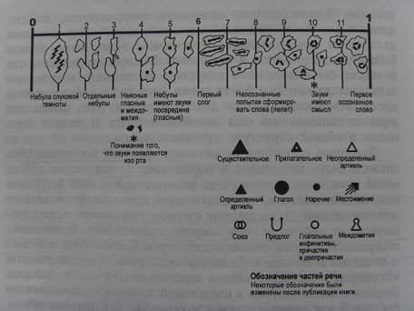 Рис. 8. Развитие языка от стадии небулы до осознанного выражения в грамматической форме чтобы совершенствовать любой вид активности, на последнем этапе цикла понадобится движение. Другими словами, более высокий духовный уровень может быть достигнут только с помощью движения. Именно с этой точки зрения необходимо оценивать движение. Оно связано со всей деятельностью центральной нервной системы, и в этом качестве не может быть проигнорировано. Система взаимоотношений является единым целым, несмотря на то что она состоит из трех частей. Будучи единым целым, она может стать совершенной, лишь работая как единое целое.
