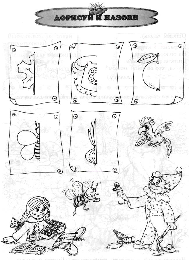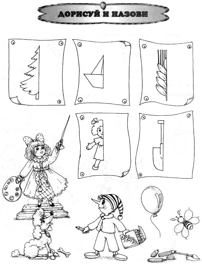 Помоги клоуну и кукле дорисовать предметы и назвать их.