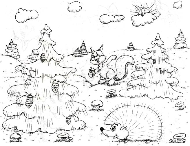 Дорисуй иголки ёжику и ёлке по серым линиям, проговаривая: «Иголка, колючая иголочка».