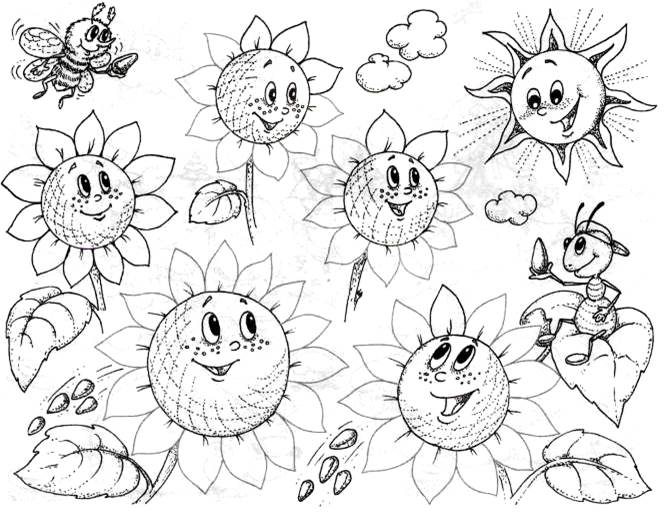 Жёлтый Антошка Вертится на ножке. Где солнце стоит, Туда и он глядит. (Подсолнух) Возьми жёлтый карандаш и дорисуй по контуру лепестки у подсолнухов. Рисуй и проговаривай: «Лепесток, жёлтый лепесток».