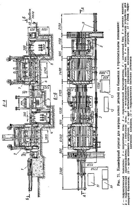 ОБРАБОТКИ И ХИМИКО-ТЕРМИЧЕСКОЙ АГРЕГАТЫ ДЛЯ ТЕРМИЧЕСКОЙ В современных термических цехах массового или крупносерийного производства несколько видов оборудования (печи, закалочные баки, моечные машины и др.), связанных общим производственным циклом, устанавливаются один за другим в порядке последовательности операций и составляют таким образом агрегат для термической обработки. Очень часто агрегат представляет собой установку из закалочной печи толкательного или конвейерного типа, конвейерного закалочного бака и отпускной печи с толкателем или с конвейером. Обычно такие агрегаты устанавливают в одну линию. Например, агрегат для обработки рессорных листов (рис. 70) состоит из закалочной печи, машины для гибки и закалки листов, закалочного конвейерного бака, отпускной печи и охладительного конвейерного бака. Этот агрегат также устанавливают в одну линию длиной около 44 м. Агрегат обслуживается бригадой из пяти рабочих. Для линии термической обработки рессор разработан новый процесс: нагретые листы с конвейера закалочной печи попадают на склиз и затем в приспособление, которое передает их для закалки в штампы десятигранной гибочно-закалочной машины. После закалки листы вынимают из штампов и магнитным краном устанавливают на ребро на конвейер отпускной печи. Конвейерный закалочный бак в этом случае не требуется. Иногда в агрегатах для обработки рессор используют печи с шагающим подом. Другой агрегат для термической обработки с проходными электропечами Гипроавтопрома показан на рис. 71. Этот агрегат предназначен для нагрева в горизонтальном положении крупных длинных деталей, передвижение которых производится на башмаках. Агрегат состоит из закалочной печи, механизированного закалочного бака, моечной машины, отпускной печи и механизированного охладительного бака; возврат башмаков к загрузочной части закалочной печи производится при помощи автоматического устройства. Толкание башмаков с деталями через печи, выгрузка из печей, передача их между печами производится с помощью гидравлических толкателей, вытаскивателей и пере-таскивателя. Для этого агрегат снабжен гидравлической насосной установкой и стендом гидравлических клапанов с электромагнитов