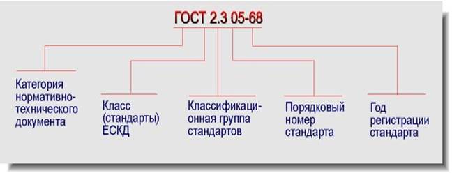 Обозначение стандартов ЕСКД строится на классификационном принципе. Номер стандарта составляется из цифры 2, присвоенной классу стандартов ЕСКД; одной цифры (после точки), обозначающей классификационную группу (шифр группы) стандартов; двузначной цифры, определяющей порядковый номер стандарта в данной группе, и двузначной цифры (после тире), указывающей год регистрации стандарта. Пример обозначения стандарта ЕСКД "Изображения - виды, разрезы, сечения":