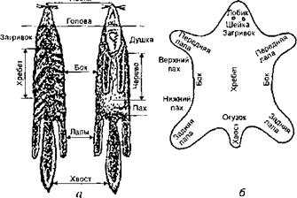 Загривок — участок шкуры между ушами и вершинами лопаток. Вороток — шейная часть овчин до линии, соединяющей верхние впадины передних лап. Хребтик — участок шкуры в виде продольной полосы, расположенной на теле животного вдоль позвоночника. Огузок — участок шкуры, соответствующий крестцовой области тела животного. Черево — брюшной участок шкуры, расположенный между основаниями передних и задних лап. Душка — участок шкуры, соответствующий груди и горлу животного. Грудцо — передний белый участок на черевой стороне шкурки белки. Вока — участки шкуры, соответствующие бокам тела животного. Бедро — часть шкуры, прилегающая к огузку и покрывающая задние конечности животного до коленного сустава. Бедерка — нижняя половина брюшной части шкурки белки. Полы — участки шкурки, соответствующие бокам тела животного. Пашины — лишенные волоса части шкурки в местах соединения лап с полами. Шкурка на 60—70 % состоит из воды. Белков в ней содержится 35—40 % (от массы сухого остатка). Кератин является основным белком, образующим волос и роговой слой эпидермиса. Основной слой кожевой ткани — дерма — состоит главным образом из белка коллагена (96—98 % общего количества белков дермы). Содержание жиров в шкурках сильно колеблется и у некоторых животных достигает 30 % и более. Углеводы составляют 2 % массы сухого вещества кожевой ткани. Минеральные вещества (соли кальция, натрия, железа) находятся в шкурке в небольшом количестве — 0,35—0,50 %. Изменчивость волосяного и кожного покровов. Товарные свойства шкур животных как разных видов, так и одного могут заметно различаться. В основе этих различий лежат биологические особенности волосяного и кожного покровов шкур и их изменчивость под влиянием факторов внешней среды. Биологическая изменчивость волосяного покрова пушных и меховых животных связана в первую очередь со средой, а также с географическим районом обитания (географическая изменчивость), временем года (сезонная изменчивость), полом (половая изменчивость), возрастом (возрастная изменчивость) и индивидуальными отклонениями отдельных особей (индивидуальная изменчивость). На изменчивость волосяного покрова домашних животных заметно влияют порода, условия кормления и содержания. Изменчивость от среды обитания. Среда обитания оказывает большое влияние на формирование структуры и свойств волосяного покрова пушных зверей. По среде обитания животные делятся на наземные, подземные и земноводные. Пушные звери, ведущие наземный образ жизни (а таких большинство — соболь, песец, куница, лисица, белка и др.), отличаются пушистым волосяным покровом, сильно дифференцированным по степени опушенности на отдельных частях тела. У них хорошо опушены хребет, огузок и бока, а черево — наиболее скрытая часть тела — опушена слабо. Кожный покров наиболее толстый на хребте и огузке, тоньше на боках и самый тонкий на череве. Пушные звери, ведущие подземный образ жизни, т.е. проводящие большую часть времени под землей или в норах (крот, слепыш, цокорь), имеют короткий, густой и однообразный по топографии волосяной покров. Направляющие и остевые волосы лишь незначительно длиннее пуховых. Окраска волосяного покрова шкурки однотонная. Кожный покров на череве толще, чем на хребте. У пушных зверей, ведущих земноводный образ жизни (выдры, норки, ондатры, бобра, выхухоли, мор