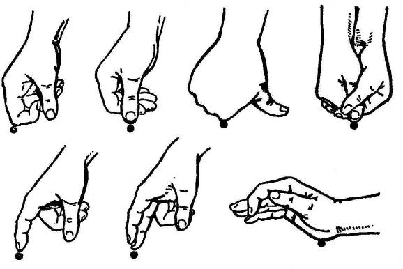 Рис. 3.2. Положение пальцев и кистей рук Противопоказания: наличие злокачественных и доброкачественных новообразований любой локализации, при высокой температуре тела, активных формах туберкулеза, язвенной болезни желудка, резком истощении, заболеваниях крови, состоянии острого психического возбуждения, при беременности и в старческом возрасте. Не следует делать точечный массаж натощак, а также при резких перепадах атмосферного давления. Следует отказаться от крепкого кофе, острой и соленой пищи. Методика. Важно максимально точно найти БАТ. В Китае для более точного определения точек используется индивидуальный цунь — расстояние, образовавшееся между складками средней фаланги при сгибании третьего пальца (у мужчин на левой кисти, у женщин — на правой). Абсолютный цунь как единица измерения равен 2,5 сантиметра. Перед массажем нужно расслабиться, постараться по возможности отвлечься от всего постороннего, разогреть руки и осторожно нащупать точку кончиком пальца. При надавливании БАТ возникает ощущение боли или ломоты. Давление необходимо производить подушечкой пальца. Надавливание не должно быть грубым, резким, вызывать сильную боль или оставлять синяки. Оно должно напоминать касание или легкое безостановочное поглаживание, при котором используется тяжесть пальца или кисти. Если малыш жалуется на боль — массировать осторожнее, если возникает головокружение — массаж необходимо прекратить. Движение пальца — горизонтально-вращательное направленное по часовой стрелке, или вибрирующее, но всегда безостановочное. Вращение или вибрацию производят в определенном темпе (замедляющем или ускоряющем) и сочетают с некоторым давлением. Древневосточные каноны успокаивающий массаж рекомендовали делать только после захода солнца, во время полнолуния. Этот вид массажа характеризуется непрерывным воздействием плавными, медленными, вращательными движениями без смещения кожи или надавливанием подушечкой пальца с постепенным нарастанием силы давления (без заметной ямки) и задержкой пальца на глубине. Прием повторяют 3—4 раза с возвращением каждый раз к исходному положению, не отрывая пальца от точки. Длительность массажа каждой точки 3-5 минут. Этот метод также эффективен при острой боли, бессоннице, тревоге, нервном возбуждении. Тонизирующий массаж наиболее эффективен во время новолуния. Он характеризуется коротким сильным надавливанием и быстрым резким удалением пальца от точки. К тонизирующему методу относится и прерывистая вибрация; Длительность воздействия 0,5—1 минута. Этот прием также эффективен при судорогах и физическом утомлении. В коррекционной педагогике мы используем точечный массаж биологически активных точек в работе с детьми, состояние и поведение которых обусловлено остаточными явлениями органического поражения головного мозга (патологическая беременность, инфекции, родовые и черепно-мозговые травмы). Этот контингент детей довольно широко представлен в каждом детском учреждении. Их характеризует повышенная утомляемость, истощаемость нервной системы, плохая переключаемость, неравномерная работоспособность, рассеянность, неусидчивость, расторможенность, драчливость или же пассивность, депрессивное состояние, плаксивость. Мы убедились, что, воздействуя на БАТ, удается расслабить гипертонус, с