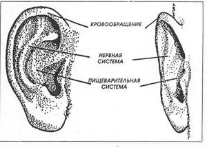 Рис. 14 Области ушной раковины и их соответствие системам организма.