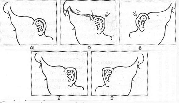 По мнению физиогномистов форма, размер и расположение ушей несут богатую информацию о человеке. Анализируя внешность представителей различных народностей, исторических личностей и сопоставляя строение ушных раковин с другими частями лица, с характером человека и его поведением, физиогномисты, древние и современные, делали удивительные и достоверные заключения. Так, Бюффон считал маленькие уши красивыми. Они свойственны упорным и настойчивым людям, добивающимся триумфа своих взглядов и убеждений. Владельцы таких ушей музыкальны, чувственны, чистосердечны и эмоциональны. Массивные уши с округлыми и четкими очертаниями чаще присущи флегматикам, людям тучным и крупным, а мясистые уши – грубым лицам. Слишком мясистые, толстые уши чаще всего бывают у людей угрюмых, жестких, с тяжелым характером, суровым нравом. Узкие, продолговатые, длинные уши выдают человека завистливого и скупого, но в сочетании со сложным и тонким рисунком внутренней части раковины, наблюдаются у людей, наделенных большими способностями. Уши, заостренные сверху – признак умеренности и сдержанности, а ярко выраженные извилины в ушах – показатель музыкальных способностей. У артистических, талантливых и одаренных людей ушные раковины, как правило, глубокие и выразительные. Уши, прижатые к голове, об упрямстве, осторожности, выдержке, хитрости, хладнокровии и лицемерии. Меркантильных и хитрых людей выдают большие, оттопыренные уши. Даже цвет кожи ушных раковин несет в себе определенную информацию. Древние считали, что люди с большими и ярко окрашенными ушами обладают грубым умом и долго живут. А вот ярко окрашенные уши на более бледном лице – признак аристократизма, хорошего здоровья и зажиточности. Красивые уши присущи людям раздражительным, вспыльчивым и стыдливым. Темно – лиловый, желтоватый или голубоватый цвет кожи ушной раковины бывает у людей с плохим здоровьем, склонных к депрессиям и ленности. Для равнодушных, необщительных людей характерен более светлый цвет ушей, чем цвет кожи лица. Уши здорового, розового цвета выдают доброго, душевного и отзывчивого человека с хорошим здоровьем. Богатую информацию о человеке и отдельных чертах его характера, несет внешний ободок уха. Если он круглой формы, без выступов и впадин, значит принадлежит человеку умному, энергичному, с твердым характером (рис. 17а). Если внешний ободок имеет один или несколько выступов, то, скорее всего, владелец такого уха – человек очень упорный, бескомпромисный, аккуратный и старательный (рис. №17б). Человек, имеющий на внешнем ободке уха впадину (рис. 17в), отличается доброжелательностью, Терпением но, часто, подвержен повышенному вниманию окружающих и обстановки. Четырехугольная форма ободка (рис. 17г) характерна для интеллектуальных, аналитически мыслящих и ответственных людей, с выраженной любовью к жизни. Треугольная форма ободка присуща людям гармоничного, миролюбивого характера, легко сходящегося с людьми (рис. 17д).