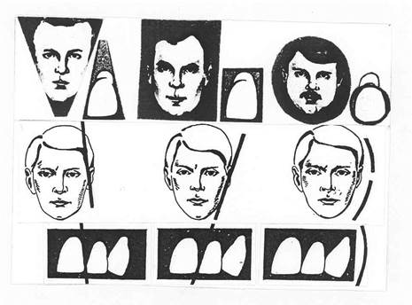 Оценивать красоту улыбки только по положению губ и мягких тканей лица не верно. Известно около сорока признаков, составляющих красоту улыбки. Одними из важнейших являются обнажение зубов, их форма, цвет и положение, негативное пространство, отношение верхнего резцового края к нижней губе, выраженность «щечного коридора» и симметричность улыбки. В зависимости от высоты губы, выраженности ее уздечки, вида прикуса и активности верхней или нижней губы, обнажение зубов может быть различным (рис. 33): резцовым (а), пришеечным (цервикальным) (б) и десневым (в). Попытки методом фотомонтажа или компьютерной графики совместить пространство между губами одного человека, с зубным рядом другого (форма и соотношения зубов иные), приводили к резкому нарушению гармонии лица и красоты улыбки известных фотомоделей, актрис и политиков. Это подтверждает индивидуальность, соразмерность и гармонию применительно к красоте конкретного человека. Для высоких людей астенического типа, с продолговатым лицом, характерны длинные и узкие прямоугольные губы, а для круглолицых – губы умеренной длины, с закругленными углами и овоидной формы. Стоматологи при восстановлении утраченных передних зубов, используют правила зубной гармонии Вильямса и триаду Нельсона (рис. 34). Сущность этих правил и законов гармонии состоит в соответствии контура лица контурам зубов, имеющим приближение к квадратной, овальной, конической и смешанной формам, и гармоничном взаимоотношении между формой лица, формой зубной дуги и формой зубов.