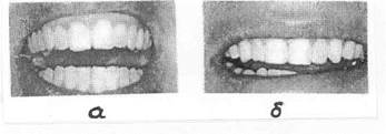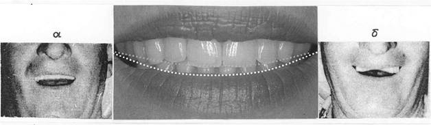 Ансамбль шести передних зубов, наиболее видимых при улыбке, образует верхнюю зубную дугу, ограниченную сверху десневой линией, а снизу режущим краем. Одним из признаков красивой улыбки является соответствие выпуклости режущего края верхней зубной дуги – вогнутости верхнего края нижней губы (рис. 35б). Плоская (а) и вогнутая (в) резцовые линии – непривлекательны.