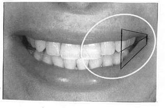 У молодых людей центральные резцы также длиннее боковых, и это придает им форму стандартного прямоугольника, в котором ширина составляет 60 или меньше процентов от длины. Режущий край центральных резцов часто выглядит неровным (маммелоны) с закруглениями медиального и дистального углов. По мере старения организма зубы стираются, и длина центральных резцов становится равной длине боковых резцов. Укорочение центральных резцов, в то время как их ширина остается постоянной, их форма меняется от прямоугольной к квадратной, и процентное соотношение ширины к длине составляет уже не 60, а 100 и более процентов. Режущий край притупляется, стираются маммолоны, а мезио-дистальные углы становятся прямыми. Дизайн улыбки с учетом элементов пола, состоит в том, что определяющим фактором в этом отношении является боковой резец, который у женщин сужен у десны, имеет форму четырехугольника, с расходящимися книзу боковыми сторонами и закругленным режущим краем. Сам зуб значительно уже, чем центральный резец. Мужской боковой резец, как правило, шире у шейки и имеет форму прямоугольника с более параллельными боковыми сторонами, а режущий край у такого зуба более плоский. Особое влияние на восприятие улыбки может иметь клык, способный при выраженности рвущего бугра, придавать лицу атрибут агрессивности, свирепости и жестокости, что с точки зрения дизайна, является отражением пассивной агрессивности характера. Следующим компонентом улыбки, украшающим или портящим ее, является негативное пространство между рядами белых зубов. Оно возникает при открытой улыбке и разомкнутых зубных рядах, в виде темной полосы, узкой или широкой, симметричной (а) или деформированной (б), (рис. 37).