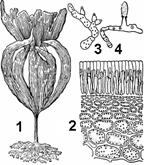Представители рода ламинария известны под названием «морская капуста» (рис. 59). Они широко распространены в северных морях. Зрелый спорофит ламинарии — растение длиной от 0,5 до 6 и более метров. Слоевище ламинарии имеет одну или несколько листоподобных пластинок, располагающихся на простом или разветвленном "стволе", прикрепленном к субстрату ризоидами. "Ствол" с ризоидами многолетние, а пластинка ежегодно отмирает и весной вновь отрастает. Для ламинарии характерен вставочный рост. Зона роста располагается между пластинкой и "стволом". На поверхности пластинок формируются зооспорангии, в которых в результате мейотического деления образуются гаплоидные зооспоры с двумя неравными жгутиками. Они прорастают в микроскопические нитчатые гаметофиты, на которых образуются половые органы. Половой процесс оогамный. В оогониях и антеридиях образуется по одной гамете. Оплодотворение происходит за пределами оогония. Из зиготы без периода покоя развивается диплоидный спорофит. Ламинарию используют в пищу, для лечебного питания.