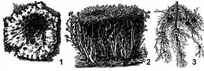 © гомеомерное слоевище — слоевище, в котором клетки водорослей более или менее равномерно распределены по всей толще слоевища; © гетеромерное слоевище — слоевище, у которого гифы гриба с верхней и нижней стороны образуют плотное сплетение — корку, между которыми имеется сердцевина из рыхло расположенных гиф и слой водорослей (непосредственно под верхней коркой). Чаще всего встречается следующие типа организации слоевища (рис. 89): © накипные, или корковые — тело в виде корочки или накипи, тесно связанное с субстратом всей поверхностью (леконора); © листоватые — тело в виде листовидных пластинок, прикрепленных к почве или деревьям при помощи пучков гиф (пармелия, ксантория); © кустистые — тело имеет вид более или менее разветвленных кустиков, высотой до 12-15 см (исландский лишайник, ягель, олений лишайник — кладония).