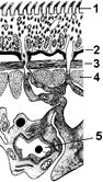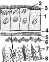 © Покровы и кожно-мускульный мешок. принципиально не отличаются от таковых у сосальщиков, но тегумент образует огромное количество волосковых выростов, увеличивающих площадь всасывания питательных веществ (рис. 114). © Пищеварительная система полностью отсутствует. Питательные вещества поглощаются с помощью тегумента, расщепление их и получение необходимой энергии происходит в результате бескислородного окисления — гликолиза. © Выделительная система представлена протонефридиями и каналами. Самые крупные — боковые выделительные каналы — открываются на последнем членике. © Нервная система развита слабо, как и у сосальщиков. Представлена нервными ганглиями, которые находятся в головке, и нервными стволами, из которых боковые развиты сильнее и соединены поперечными нервными перемычками. Органы зрения не развиты. © Размножение и развитие. Половая системагермафродитного типа. В молодых члениках половые органы не развиты, их развитие начинается после 200 членика, в последних члениках атрофируются семенники, семяпроводы, яичники и яйцеводы и очень сильно развивается матка, в которой находятся оплодотворенные яйца. Оплодотворение у цепней или перекрестное, или происходит самооплодотворение между различными члениками. Последние членики стробилы отрываются целыми группами и с фекалиями выводятся наружу.