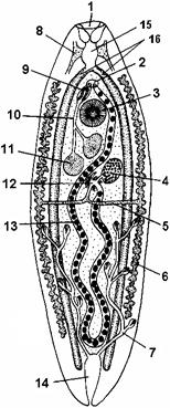 © Пищеварительная система начинается ротовой присоской и глоткой сосущего типа. Затем идет пищевод и кишечник, обычно двуветвистый. Поверхность кишечника сильно ветвится, что важно для доставки питательных веществ ко всем клеткам тела. Анальное отверстие отсутствует. © Выделительная система протонефридиального типа, то есть начинается протонефридиями, каналы соединяются в два главных канала, которые на задней части тела открываются в мочевой пузырь, и через выделительное отверстие продукты выделения удаляются из организма. ©