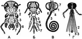 Класс Насекомые объединяет более 1 млн. видов членистоногих животных, для которых характерно расчленение тела на три отдела: голову, грудь и брюшко. На груди находится три пары ног, брюшко лишено конечностей. Большинство имеют крылья и способны к активному полету. © Внешнее строение. На голове насекомых имеются сложные (фасеточные) глаза, у некоторых видов, кроме них, имеются и простые глаза. На голове имеются четыре пары придатков: первая пара — усики (антенны), органы обоняния, остальные три пары образуют ротовой аппарат. Верхняя губа прикрывает верхние челюсти. Вторая пара ротовых придатков образует верхние челюсти, третья пара — нижние челюсти, четвертая пара срастается и образует нижнюю губу. На нижней челюсти и нижней губе могут находиться по паре щупиков. К ротовому аппарату относится язык — хитиновое выпячивание дна ротовой полости. В связи с типом питания, ротовые аппараты могут быть различных типов (рис. 128):