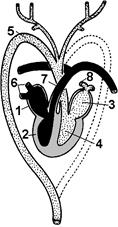 Кроме однонаправленности движения воздуха, насыщение крови кислородом обеспечивается противоточным движением крови по отношению к движению воздуха. Благодаря этому осуществляется необычайно высокая эффективность газообмена, при которой организм получает достаточное количество кислорода даже на больших высотах. Другая важная функция воздушных мешков — предохранение организма от перегревания: воздух охлаждает внутренние органы и мускулатуру (теплопродукция в полете в 8 раз больше, чем при покое). Воздушные мешки уменьшают плотность тела, некоторые воздушные мешки даже врастают в полости трубчатых костей. Общий объем воздушных мешков в 10 раз превышает объем легких. Частота дыхательных движений у голубя в покое в среднем 26, в полете — 400, это связано и с выведением избыточного тепла через органы дыхания. При необходимости происходит так называемая тепловая одышка, это приводит к увеличению теплоотдачи вместе с выдыхаемым воздухом и большему испарению влаги с поверхности дыхательных путей. © Кровеносная система. Высокий уровень обмена веществ, теплокровность привели к существенному изменению и кровеносной системы. Сердце становится четырехкамерным, перегородка делит сердце на две части — правую и левую. Каждая часть сердца состоит из предсердия и желудочка. Венозная кровь в правую половину сердца возвращается по полым венам (верхней и нижней) из большого круга кровообращения (рис. 162).