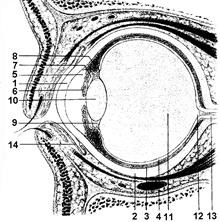 Орган зрения — важнейший из органов чувств, обеспечивающий человеку до 90% информации. Периферическая часть анализатора — орган зрения состоит из глазного яблока и вспомогательных органов: веки, ресницы, слезные железы, глазодвигательные мышцы (рис. 235). Стенка глазного яблока состоит из трех оболочек. Наружная — белочная оболочка (склера) в передней части глаза прозрачная, этот ее участок называется роговицей. Под белочной оболочкой находится сосудистая оболочка, питающая глаз. В передней части сосудистая оболочка переходит в радужку, имеющую в центре отверстие — зрачок. Кольцевые и радиальные мышцы радужки рефлекторно меняют диаметр зрачка, регулируя количество света, попадающее внутрь глаза. От пигмента