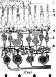 Между роговицей и радужкой находится полость, заполненная влагой — передняя камера глаза. Полость между радужкой и хрусталиком называется задней камерой глаза. Третья оболочка глазного яблока — сетчатка (рис. 236). В ней расположены светочувствительные клетки — зрительные рецепторы, около 130 млн. палочек, обеспечивающих черно-белое видение и около 7 млн. колбочек, дающих информацию о цвете. Максимальное количество колбочек находится в сетчатке на оптической оси глаза, против зрачка, этот участок называется желтым пятном. В том месте, где от глазного яблока отходи зрительный нерв, в сетчатке нет рецепторов — слепое пятно. Максимальное количество палочек находится на периферии глаза. Палочки содержат зрительный пигмент родопсин, для его разложение достаточно небольшого количества света. В колбочках под действие света происходит разложение йодопсина, но для возбуждения колбочек нужно большее количество света. Сетчатка состоит из нескольких слоев клеток: наружный, прилегающий к сосудистой оболочке — слой пигментных клеток черного цвета. Этот слой поглощает свет, препятствуя его рассеиванию и отражению. Затем идет слой, содержащий палочки и колбочки, перед ним еще три слоя клеток. Стекловидное тело заполняет всю полость глаза, образовано прозрачным студенистым веществом. Между стекловидным телом и задней камерой глаза располагается хрусталик, упругое прозрачное образование в виде двояковыпуклой линзы. Хрусталик преломляет лучи света и собирает их в фокусе на сетчатке. С помощью цинновых связок он прикреплен к ресничной (цилиарной) мышце. Свет проходит роговицу, жидкость передней камеры глаза, через зрачок попадает в заднюю камеру, проходит через хрусталик, стекловидное тело и попадает на сетчатку. Световые лучи претерпевают наибольшее преломление в роговице и хрусталике, изображение на сетчатке уменьшенное и перевернутое.