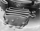 Одномембранный органоид, представляющий собой систему мембран, формирующих цистерны и каналы, соединенных друг с другом и ограничивающих единое внутреннее пространство — полость ЭПР. Мембраны с одной стороны связаны с наружной цитоплазматической мембраной, с другой — с наружной оболочкой ядерной мембраны. Наибольшего развития ЭПР достигает в клетках с интенсивным обменом веществ. В среднем он составляет от 30 до 50 % всего объема клетки. Различают три вида ЭПР: © шероховатый, содержащий на своей поверхности рибосомы и представляющий собой совокупность уплощенных мешочков; © гладкий, мембраны которого рибосом не несут, по строению он ближе к трубчатому; © п ромежуточный — частично гладкий, частично шероховатый; большая часть ЭПР клеток представлена именно этим видом. Функции ЭПР: © разделяет цитоплазму клетки на изолированные отсеки (компартменты), обеспечивая тем самым пространственное отграничение друг от друга множества параллельно идущих реакций; © содержит мультиферментные системы, обеспечивающие поэтапное протекание биосинтетических процессов; © осуществляет синтез и расщепление углеводов и липидов (гладкий ЭПР); © обеспечивает синтез белка (шероховатый ЭПР); © накапливает в каналах и полостях, а затем транспортирует к органоидам клетки продукты биосинтеза; © служит местом образования цистерн аппарата Гольджи (промежуточный ЭПР).