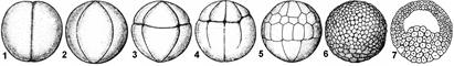 После оплодотворения зигота начинает делиться. Дроблением называют ряд последовательных митотических делений зиготы, в результате которых огромный объем цитоплазмы яйца разделяется на многочисленные, содержащие ядра клетки меньшего размера (рис. 312). В результате дробления образуются клетки, которые называют бластомерами. Важной отличительной особенностью дробления от обычного деления является то, что вновь образовавшиеся бластомеры не увеличиваются в размерах. Это осуществляется путем выпадения интерфазного периода роста между делениями. При этом синтетический период интерфазы начинается в телофазе предшествующего митотического цикла. Таким образом, количество бластомеров постепенно увеличивается, а их общий объем практически не изменяется. Цитоплазма клеток при дроблении делится путем возникновения впячиваний оболочки клетки (борозды дробления).