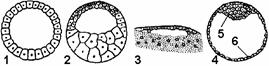 © Дискобластула. Образуется при дискоидальном дроблении. Полость бластулы имеет вид узкой щели, находящейся под зародышевым диском (у птиц). © Бластоциста. Представляет собой однослойный пузырек, заполненный жидкостью, в котором различают эмбриобласт (из него развивается зародыш) и трофобласт, обеспечивающий питание зародыша (у млекопитающих).