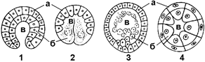 Строение бластулы во многом зависит от типа дробления (рис. 314). © Целобластула (типичная бластула). Образуется при равномерном дроблении. Имеет вид однослойного пузырька с большим бластоцелем (у ланцетника). © Амфибластула. При дроблении телолецитальных яиц бластодерма построена из бластомеров разного размера: микромеров на анимальном и макромеров на вегетативном полюсах. Бластоцель при этом смещается в сторону анимального полюса (у земноводных).
