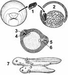 Наблюдения за оплодотворенной яйцеклеткой лягушки позволили проследить путь развития клеток, входящих в состав того или иного участка зародыша. Оказалось, что определенные клетки, занимающие соответствующее место в бластуле, дают начало строго определенным зачаткам органов. Удалось выяснить, какие группы клеток дают начало нервной трубке, хорде, мезодерме, кожному эпителию и т.д. Действительно, в развивающемся организме различные группы клеток дают начало определенным органам и тканям, а культивирование клеток вне зародыша (в пробирке) не приводит к формированию типичных тканевых структур, которые должны были бы образоваться из клеток. Чем же вызывается преобразование тех или иных клеток зародыша в конкретные ткани и органы? В 1924 г. были опубликованы результаты опытов Г.Шпемана и Г.Мангольда, посвященные выяснению этого вопроса (рис. 318). На стадии ранней гаструлы зачаток эктодермы, который в нормальных условиях должен был развиться в структуры нервной системы, из зародыша гребенчатого (непигментриованного) тритона пересаживался под эктодерму брюшной стороны, дающую начало эпидермису кожи, зародыша обыкновенного (пигментированного) тритона. В итоге на брюшной стороне зародыша-реципиента возникала сначала нервная трубка и другие компоненты комплекса осевых органов, а затем формировался дополнительный зародыш. Причем, наблюдения показали, что ткани дополнительного зародыша формируются почти исключительно из клеточного материала реципиента. Эти данные доказывают, что в ходе эмбриогенеза некоторые части зародыша влияют на пути развития соседних участков. Такое влияние одного зачатка на другой получило название эмбриональной индукции. Насколько важную роль играет эмбриональная индукция в развитии, показывает следующий опыт. Если на стадии ранней гаструлы полностью удалить