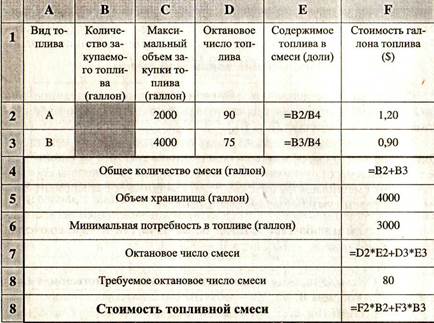 Изменяемые ячейки: D3:E4; С10:С11. Ограничение по времени использования станков: С10:С11<=ЕШ:Е11. Целевая ячейка: G13. Задачи смеси Как правило, в таких задачах требуется определить такой состав смеси различных продуктов, который удовлетворяет заданным ограничениям по ее качеству (например, по калорийности, пластичности, содержанию питательных веществ) и вместе с тем определяет смесь минимальной стоимости. В литературе часто встречается и другое название для этого класса задач — «задачи о диете». Для этого вида оптимизационных задач характерно наличие процентных (или долевых) ограничений. Ниже приводится пример структуризации задачи этого типа. Определение топливной смеси Фирма хочет использовать для своих грузовиков смешанное топливо с целью сокращения транспортных расходов. Планируется смешивать два вида топлива (Аи В). Смешанное топливо должно иметь октановое число не меньше 80. Октановое число смеси является взвешенным средним октановых чисел смешиваемых компонент, причем веса пропорциональны соответствующим смешиваемым объемам (при смешивании компонент объем смеси равен сумме объемов компонент): ОЧсм = Ва*ОЧа + ВЬ*ОЧв; Ва - Va/(Va + Vb); Bb = Vs/(Va + Vb). Здесь ОЧсм, ОЧа, ОЧв — октановые числа соответственно смеси, топлива А и топлива В, Va, Vb — объемы смешиваемых топлив А и В. Для обеспечения всех грузовиков фирмы в течение следующего месяца необходимо не менее 3000 галлонов топлива. Фирма располагает хранилищем для топлива емкостью 4000 галлонов. Возможно приобретение до 2000 галлонов топлива А и 4000 галлонов топлива В. Топливо А имеет октановое число 90 и стоимость $1,20 за галлон, топливо В имеет октановое число 75 и стоимость $0,90 за галлон. Определите смесь минимальной стоимости. 46 Часть 1. Поиск решений на электронных таблицах Примеры структуризации задач 47
