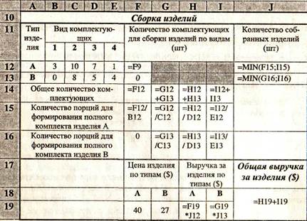 N2=5*X21+6*X22; (комплектующие второго вида); N3=7*X31+12*X32; (комплектующие третьего вида); N4=8*X41+3*X42 (комплектующие четвертого вида). Введем дополнительные варьируемые переменные «второго уровня» Nia — количество комплектующих i-oro вида, используемых для сборки изделия А, аналогично Nib (Nia + Nib = Ni; i = 2, 3, 4). При решении этой задачи целесообразно использовать понятие полного комплекта — набора комплектующих, из которых может быть собрано одно изделие. Так, для изделия А полным комплектом является набор (3, 10, 7, 1), а для изделия В — (0, 8, 5, 4). Любой комплект составляется из порций комплектующих разных видов. Для изделия А это 4 порции: 1) из трех комплектующих первого вида; 2) десяти второго вида; 3) семи третьего вида; 4) одной комплектующей четвертого вида. Дисбаланс заключается в том, что из-за различий в производительности заводов число таких порций не позволяет составить целое число полных комплектов, поэтому возникает дисбаланс, связанный с образованием остатков комплектующих одного вида и нехваткой комплектующих другого вида. Оба этих фактора влекут к снижению объемов производства изделий. При этом фактически количество выпускаемых изделий определяется минимальным количеством порций, из которых могут быть составлены полные комплекты. Например, все комплектующие первого вида используются для сборки изделий А. Какое количество изделий типа А можно собрать из комплектующих первого вида? Очевидно, это количество определяется тем, сколько порций можно собрать из комплектующих первого вида, т. е. величиной [Nl/З] (квадратные скобки определяют здесь целую часть). Комплектующие второго вида делятся на две части, одна из них идет на сборку изделий типа А, вторая — на сборку изделий типа В, при этом N2a + N2b = N2. Величина [N2a/10] определит количество порций и соответственно количество изделий типа А, которые можно собрать с учетом объема имеющихся комплектующих второго вида — N2a. Таким образом, общее количество изделий типа А, которое может быть собрано при наличии комплектующих 1/4-ого видов в количестве (N1, N2a, N3a, N4a), определится формулой: Кол-во_Изделий_А = MIN ([N1/3], [N2a/10], [N3a/7], [N4a]). Аналогично для изделий типа В: Кол-во_Изделий_В = MIN ([N2b/8], [N3b/5], [N4b/4]). Содержимое целевой ячейки: Z = 40*Кол-во_Изделий_А + 27*Кол-во_Изделий_В. Ограничения: по времени производства для завода 1: XII + Х21 + Х31 + Х41 <= 130; для завода 2: Х12 + Х22 + Х32 + Х42 <= 90. по видам комплектующих: Nia + Nib = Ni; i = 2, 3, 4; Nia, Nib = целые. Максимизировать Z. Таким образом, в этой задаче общее число варьируемых переменных (изменяемых ячеек) равно 14. Из них 8 переменных Xij имеют размерность времени, а 6 переменных (Nia, Nib) — безразмерны.