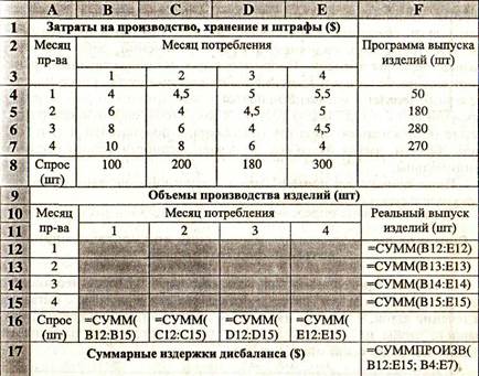 Требуется уточнить (доопределить) эту программу таким образом, чтобы она обеспечивала минимальные издержки, обусловленные несогласованностью спроса и предложения (дисбалансом). Задачи такого типа в исследовании операций известны как «транспортные задачи». Это обусловлено тем, что чаще всего такие задачи связаны с оптимизацией процессов перевозок. Вместе с тем к этому типу сводится рассматриваемая задача и многие другие, не имеющие непосредственного отношения к транспорту. Специфика этих задач заключается в использовании таблицы-матрицы, строки и столбцы которой определяют факторы дисбаланса — спрос и предложение, место производства и потребления продукции и т. п. Пусть i определяет месяц производства изделия, a j — месяц поставки. В качестве содержимого изменяемых ячеек будем использовать Xij — количество изделий, произведенных в i-ый месяц и поставленных в j-ый.