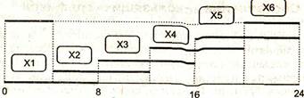 В соответствии с данными задачи количество требуемых продавцов меняется через 4 часа. Если предположить, что в первую смену работает XI продавцов, во вторую — Х2 и т. д., то график работы продавцов можно представить следующим рисунком.