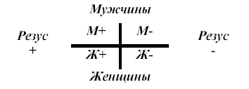 Всегда ли за математическими построениями стоит «физический» смысл? Немного отвлечёмся от соционики. Рассмотрим этот же принцип на примере других признаков, которые, с одной стороны, независимы друг от друга, а с другой – принадлежат к одной семантической плоскости. Представим, что у нас есть 2 генетически заданных признака деления: П – пол (мужчины-женщины) и Р – резус-фактор (+ и –). Таким образом, мы имеем 4 группы людей: мужчины с положительным резус-фактором (М+), мужчины с отрицательным резус-фактором (М–), женщины с положительным резус-фактором (Ж+) и женщины с отрицательным резус-фактором (Ж–) см. Рис.1. А вот три способа, которыми мы их можем сгруппировать исходя из принципа «из двух групп – одна новая»: 1) [М+М–, Ж+Ж–]; 2) [М+Ж+, М–Ж–]; 3) [М+Ж–, М–Ж+]. В первом случае группа образована по половому признаку, во втором – по резус-фактору, а в третьем? В чём смысл объединения этих групп? В чём генетическое и фенотипическое отличие группы [М+,Ж–] от группы [М–,Ж+]?