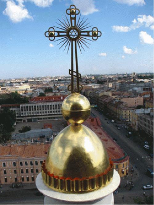 На куполе Троицкого собора скоро снова появится крест. Высотой 9 метров 25 сантиметров – один из самых больших храмовых крестов Петербурга. Его предшественник, венчавший храм с 1835-го года, погиб во время печально знаменитого пожара два года назад. Напомним, тогда огонь полностью уничтожил главный купол собора и повредил четыре малые главки. Новый крест выполнен из металла и покрыт сверху медными с золочением листами. Он до мельчайших деталей копия прежнего. Надо полагать, это был старый крест до пожара.