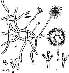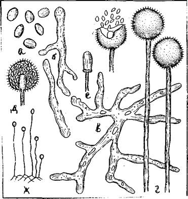 Рис. 8. Mucor mucedo: а – споры, б – прорастающие споры, в – мицелий, г – спорангиеносец, д – спорангий в разрезе, е – колонка, ж – общий вид плесени.