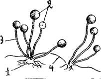 Рис.9 Rhizopus: 1 – ризоиды, 2 – спорангии, 3 – спорангиеносцы, 4 – столон.