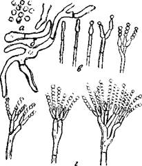 Penicillium: а – конидии; б – прорастающие конидии; в – развитие конидиеносца; г – различные конидиеносцы.