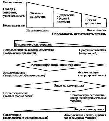 Психологические феномены депрессии 1. Раздражение, вызываемое депрессивным переживанием, заторможенность мышления. Человек, переживающий депрессию, может утратить чувство вкуса отдельных блюд. То, что раньше доставляло удовольствие, теперь может отталкивать. 2. Измененное восприятие своего тела – тяжесть и оцепенение. Человек воспринимает свое жизненное пространство как сузившееся, собственное тело может восприниматься как пустая оболочка. Переживание тяжести и скованности воспринимаются как ощущение исчерпанности. 3. Измененное восприятие времени - заторможенное и остановившееся время. 4. Измененное общение – отчужденность и пустота. Избегание контактов с другими людьми. Если понимать депрессию как неосознанную, рефлекторную попытку защитить себя в экстремальной ситуации, то в терапии предпочтение следует отдать признанию произошедшей беды и эмоциональному отношению к заболевшему. Эмпатическое расположение необходимо даже когда больной остается безучастным. Чем сильнее выражено депрессивное оцепенение, тем больше больной настроен на то, что усилия в установлении с ним контакта принадлежат другому лицу. Выбор методов терапии в зависимости от степени тяжести и стадии течения депрессивных состояний.