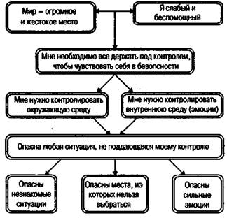 Рис. 2. Пример когнитивой карты Метод 4. «Жесткие техники опровержения» Техника 1. «Контратака» Упражнение 1 Помогите пациенту найти веские контраргументы для каждой иррациональной мысли. Проверьте, действительно ли они ее опровергают. Например, аргумент: «Невозможно преуспевать во всем» сильнее, чем: «Часто бывает довольно сложно во всем добиваться успеха». Глава 3 Пусть пациенты составят как можно больше контраргументов. Убедитесь, что контраргументы реалистичны и логичны. Когнитивная реструктурирующая терапия не поддерживает мнение о силе позитивного мышления, когда очень часто люди занимаются позитивным самообманом. Вместо этого она подчеркивает силу правдивого, реалистичного мышления и просит пациентов говорить себе правду, а не только то, что приятно звучит. Проинструктируйте пациента постоянно оспаривать иррациональные мысли. Иногда требуются месяцы, чтобы от техники появился эффект, и многие пациенты отказываются от такого вложения времени, говоря, что уже опробовали ее и безрезультатно. После выяснения затраченных пациентом усилий терапевт обычно обнаруживает, что пациент поспорил сам с собой в течение часа или двух. Пациенты должны понять, что им нужно опровергнуть утверждение столько же раз, сколько раз они за него до этого ратовали. Может быть, им придется по часу в день в течение года или более преодолевать то коренное убеждение, с которым они прожили всю жизнь. Проверьте, чтобы каждый контраргумент был одной модальности с иррациональной мыслью. Соотнесите визуальные иррациональности с контрвизуализациями, лингвистические ошибки — с лингвистическими поправками, гневливые мысли—с сострадательными, пассивные — с активными, проприо-цептивную неразумность — с проприоцептивной реальностью и т. д. Когда опровержение относится к одной модальности и тому же логическому типу, что и иррациональная мысль, больше вероятности, что оно будет иметь пробивную силу. Атакуйте все иррациональные идеи пациента, а не только отдельные из них. Важно привязать опровержение ко всем когнициям, вызывающим эмоциональный отклик. Если были упущены главные установки, терапевт может потерпеть неудачу в работе по нейтрализации эмоций. Упражнение 2 Составьте список веских контраргументов. Помогите пациенту подобрать мощное опровержение. Пациент должен попрактиковаться в технике контратаки в вашем присутствии, моделируя ваше поведение, пока не будет Психотерапия при психосоматических заболеваниях достигнут необходимый уровень напряженности. Постепенно подводите ответы пациента к драматичной, напряженной и энергичной контратаке. Терапевт может усилить контратаку, поощряя использование пациентом физического выражения эмоций, когда он постепенно сокращает мышцы. Вначале пациенты проводят контратаку с расслабленными мышцами, затем со слегка напряженными, потом — с сильно сжатыми. Часто физическое и эмоциональное напряжение у пациентов протекает параллельно. Пациенты также могут усилить контратаку, модулируя голос, постепенно повышая тон и увеличивая громкость. Контрутверждение поначалу может произноситься мягко и в нос, затем нормально, ртом, затем, пока верхние доли легких наполняются воздухом, громко, затем очень громко, с легкими, полными воздуха. Как и при физическом выражении, голос становится аналогом степени