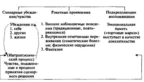 Рис. 5. Система Рэкета Глава 3 В каждой из трех колонок оставьте под заголовками как можно больше места. После этого начните заполнение вашей Системы Рэкета. Затем вспомните какую-то недавнюю ситуацию, которая закончилась для вас неблагоприятным образом или была болезненной. Если вы не хотите, то не нужно испытывать пережитое вами неприятное чувство. Вновь представив себя в этой ситуации, дополните Систему Рэкета относящимися к вам деталями. Работайте быстро и интуитивно. Для того чтобы добраться до сценарных убеждений, можно спросить себя: «Что в этой ситуации я думал о себе? О других участвующих в ней людях? О жизни и мире в целом? Как войти в контакт с чувствами, подавленными в период принятия сценарного решения?» Так как во время нахождения в Системе Рэкета эти чувства подавляются, вы не сможете достаточно ясно осознать их в анализируемой ситуации. Но существуют подсказки, которые можно использовать. Иногда можно испытывать короткий всплеск аутентичного чувства, перед тем как вы входите в рэкетное чувство. Например, если в данной ситуации вашим рэкетным чувством было раздражение, в течение доли секунды до него вы, возможно, почувствовали страх. Другой способ заключается в том, чтобы спросить себя: «Если бы я был ребенком и не знал, как цензуриро-вать свои эмоции, как бы чувствовал себя в данной ситуации? Стал бы я испытывать гнев? Безысходную печаль? Ужас? Экстаз?» Если вы сомневаетесь, что именно, попробуйте догадаться. Какие аутентичные чувства помогли бы вам завершить данную ситуацию? А теперь переходите к колонке «рэкетные проявления». Чтобы записать внешне наблюдаемые поведения, представьте себе, что вы смотрите фильм и видите самого себя. Отмечайте свои слова, тон голоса, жесты, положение тела и выражение лица. Какую рэкетную эмоцию вы испытываете? Сравните ее с вашим воспоминанием о рэкетном чувстве, которое вы испытывали в этой ситуации. В разделе «внутренне отмечаемые переживания» записывайте случаи напряжения или неудобства, ощущаемые в любой части тела. Может быть, у вас болит голова? Сосет под ложечкой? Болит шея? Помните, что отсутствие ощущений — тоже ощущение. В связи с этим исключали ли вы какие-либо части тела из своего осознания? А теперь вспомните фантазии, которые вы испытывали.