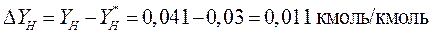 Находим движущую силу абсорбции в низу абсорбера ΔYн, кмоль ацетона/кмоль воздуха: