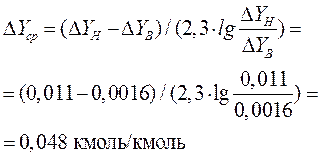 Средняя движущая сила ΔYср, кмоль ацетона/кмоль воздуха: