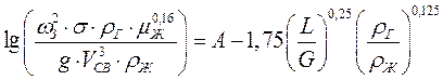где σ – удельная поверхность насадки, σ = 204 м2/м3 Определим фиктивную скорость газа ωз в точке захлебывания (инверсии) из уравнения: