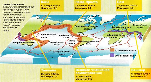 На территории России районы возможных землетрясений находятся в Прибайкалье, на Камчатке, Курильских островах, в Южной Сибири и на Северном Кавказе. Проблема защиты от землетрясений стоит очень остро. Существуют две группы антисейсмических мероприятий: • предупредительные, профилактические мероприятия, осуществляемые до возможного землетрясения (изучение природы землетрясений, раскрытие его механизма, идентификация предвестников, разработка методов прогноза); • мероприятия, осуществляемые непосредственно перед, во время и после землетрясения. Исследования природы землетрясений помогают разработать методы предотвращения и прогноза этого опасного явления. Очень важно выбирать места для расположения населенных пунктов и предприятий с учетом сейсмостойкости района. Удаленность от очагов — лучшее средство при решении вопросов безопасности при землетрясениях. Если строительство все-таки приходится вести в сейсмоопасных районах, то необходимо учитывать требования соответствующих правил и норм (СНиПов), сводящиеся в основном к усилению конструкции зданий и сооружений. Эффективность действий в условиях землетрясений зависит от уровня организации аварийно-спасательных работ и обученности населения, эффективности системы оповещения.