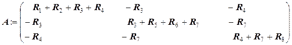 Розв’язавши систему і визначивши контурні струми І І, І ІІ, І ІІІ, неважко знайти струми у вітках схеми: I 1 = I I, I 2 = I II – I I, I 3 = I II, I 4 = I II – I III, I 5 = I I – I III, I 6 = I III. Зауважимо, що при безпосередньому використанні законів Кірхгофа для розрахунку цієї схеми необхідно було б розв’язати систему з шести рівнянь. Робочий листок MathCAD визначення струмів при конкретних значень вихідних даних для наведеної схеми має вид: ORIGIN:= 1 Вихідні дані: R 1 := 10 R 2 := 20 R 3 := 50 R 4 := 8 R 5 := 40 R 6 := 25 R 7 := 35 R 8 := 40 E 1 := 12 E 2 = 24 E 3 = 12 E 4 = 15 Матриця коефіцієнтів розрахункової системи рівнянь: