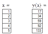 Рис.7. Вычисление многочлена. Решение. Сначала (рис.7) набирается диапазон значений x: х:=1,2..10. Здесь: 1) используется знак присвоения «:=», а не знак «=», 2) набирается первое значение х, затем через запятую второе его значение, чем задается шаг вычислений, и, наконец, последнее значение. Затем, опять-таки через знак присвоения, набирается выражение для у. Причем следует набирать у (х), а не просто у. Маткад выполняет команды слева направо и сверху вниз. Поэтому выражение для у (х) должно быть расположено справа и несколько ниже выражения «х:=» После этого следует набрать «х =» (равно, а не присвоить) и появится столбец со всеми значениями х. Так же после нажатия «у (х) =» (у(х) равно) появляется столбец вычисленных значений у(х). Построение диапазона изменения аргумента х называется РАНЖИРОВКОЙ. Задача 4. Вычислить функцию y= 3x4-7x3+4x2-9x+2 для х = 0,0.5,1,1.5......3 Пояснение. Читатель должен обратить внимание, что автор для повышения его внимания задал излишнее количество данных для ранжировки х. Необходимыми данными, которые и следует вводить, являются: первое значение, второе значение через запятую, последнее значение после двоеточия, вводимого, как указано выше. Задача 5. Вычислить функцию двух переменных z = 3x2 +4y2 + 8 для значений х= 1,1.5,2.0,....5 и для значений у = 0,0.5,1.0,....5 Пояснение. Задача решается аналогично предыдущим: Сначала производится ранжировка обеих независимых переменных х и у. Затем набирается выражение для функции «z(x,y):=» После этого набирается «х =», «у =» и «z(x,y) =»
