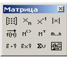 В Маткаде определены следующие действия над векторами и матрицами: А) сложение – вычитание, В) скалярное и векторное умножение, Г) Обращение, Д) транспонирование, Е) Сортировка, Ж) выделение столбцов. Они выполняются с использованием следующих кнопок панели Matrix: