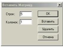 Для ввода матриц и векторов нажмем кнопку панели матриц и вызовем этим окно ввода Insetrt Matrix (ввести матрицу), показанное на рис.3.