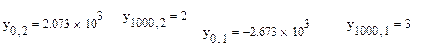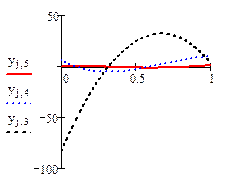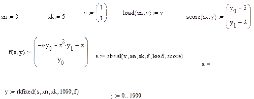 Рис.1 решение краевой задачи в Маткаде. Функция sbval вычисляет неизвестные начальные условия, а мы затем вводим их в функцию rkfixed и получаем решение. На графиках приведены те кривые, для которых заданы конечные условия, чтобы можно было убедиться в их выполнении, а именно y3(x), y4 (x), y5(x). Ниже приведены вычисленные начальные и конечные значения переменных. Весь диапазон решения разбит нами на 1000 точек (j=0..1000), поэтому y0,0 - это начальное, а y1000,0 - конечное значения y0. То же относится к другим переменным.