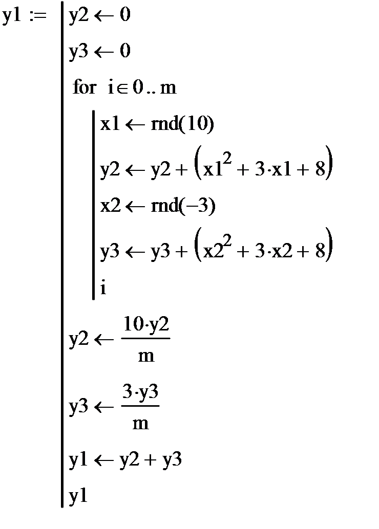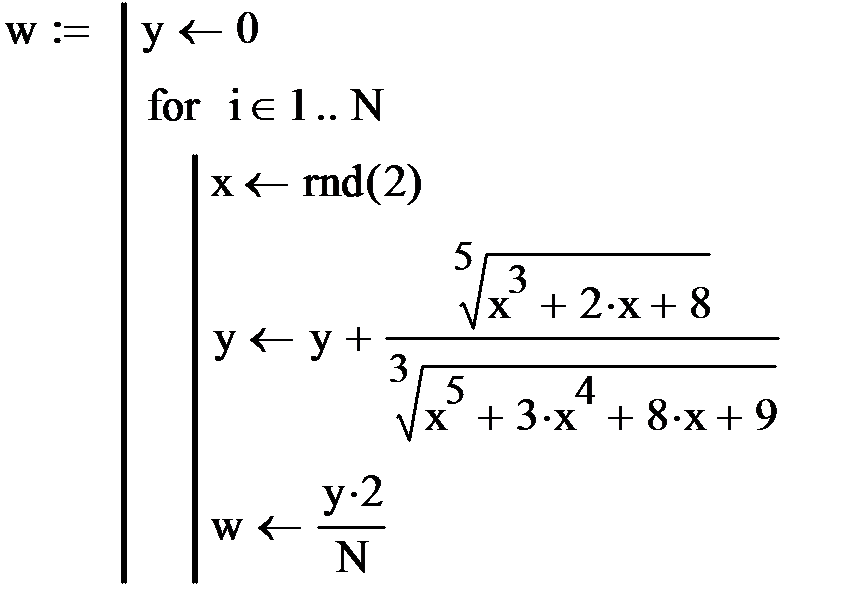 где xi - равномерно распределенная случайная величина, f(x) - подынтегральная функция, N - количество - количество случайных аргументов xi, b и a -.верхний и нижний пределы интегрирования. В Маткаде имеется встроенная функция rnd(x), возвращающая равномерно распределенную случайную величину в диапазоне 0 - x. Для решения задач методом Монте-Карло необходимо составить программу с использованием этой функции.
